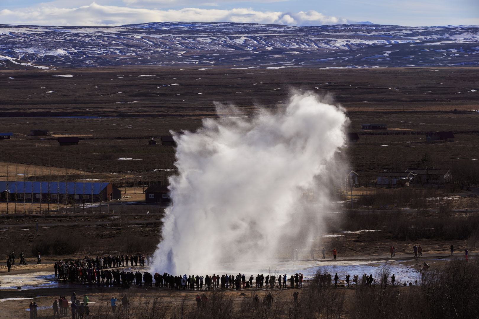 Nästa stopp blir det geotermiska området kring Geysir där vi får uppleva det fascinerande fenomenet med den aktiva gejsern Strokkur som var femte minut sprutar en kokhet vattenkaskad högt i skyn.