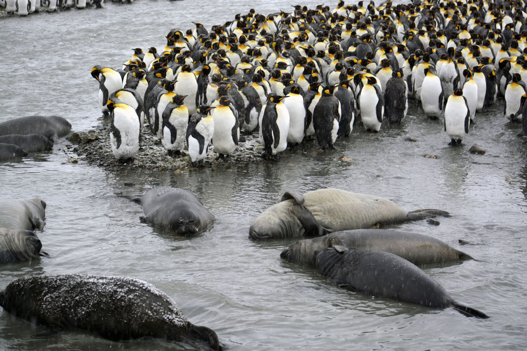 Kungspingvinerna tränger ihop sig, pälssälar och elefantsälskutar myser i sötvattnet. Foto: Mikael Grönvik, Grönlandsresor